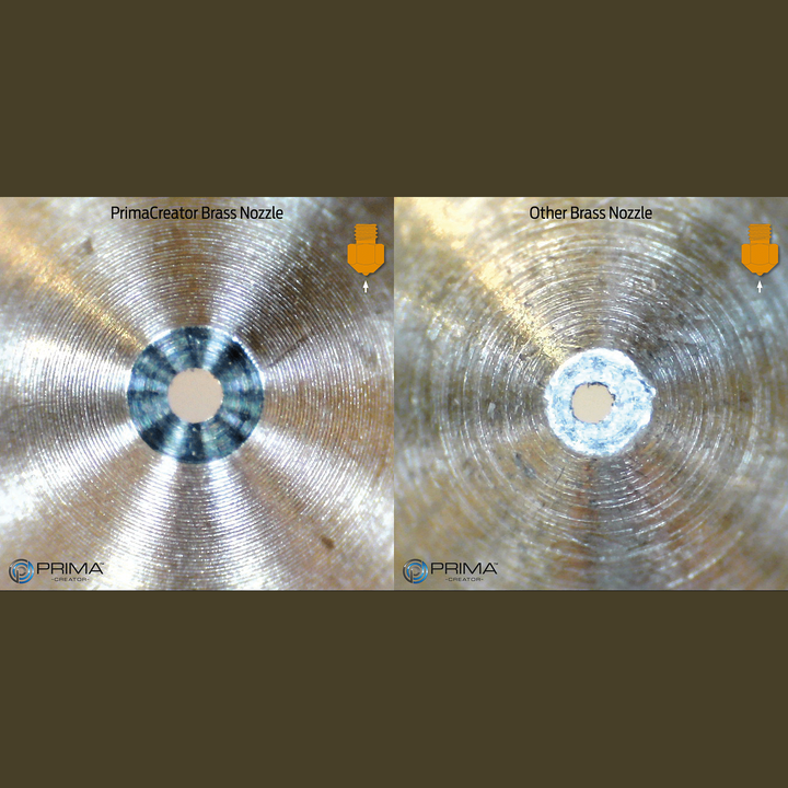 Wszystkie dysze PrimaCreator są wykonane z wysokiej jakości mosiądzu lub stali i produkowane w nowoczesnej fabryce. Tolerancja wynosi mniej niż ± 0,01 mm, co oznacza, że Twój filament podczas ekstruzji uzyskuje bardzo gładką i czystą powierzchnię, co przekłada się na lepsze wyniki druku.