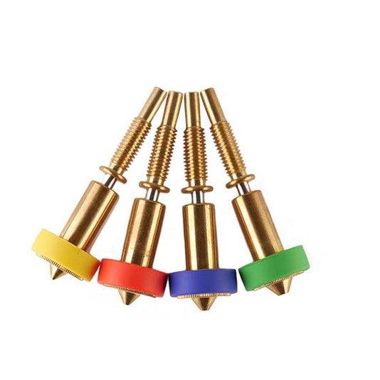 Rosnący asortyment. Jesteśmy gotowi produkować dysze RapidChange w każdym rozmiarze. Na start oferujemy mosiężne dysze w rozmiarach 0.25mm, 0.4mm, 0.6mm i 0.8mm, z wieloma innymi kompatybilnymi dyszami, które pojawią się później. Odporne na zużycie i o wysokim przepływie warianty są już w naszym planie i pojawią się z czasem.