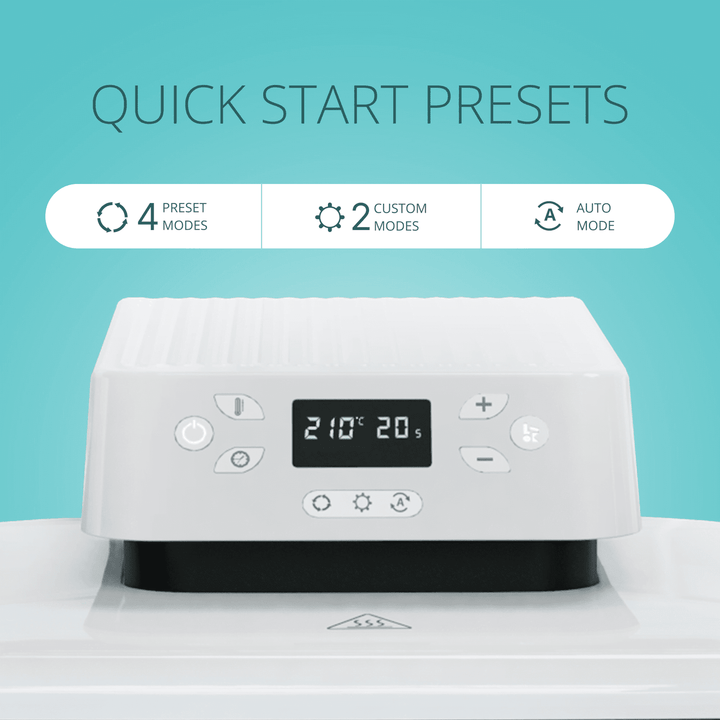 - Rozpocznij prasowanie: po prostu ustaw czas i temperaturę lub wybierz jedno z wygodnych ustawień wstępnych i naciśnij start. Auto Heat Press zrobi resztę za Ciebie.