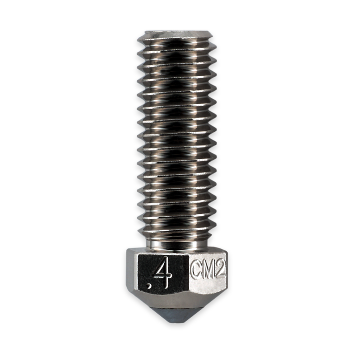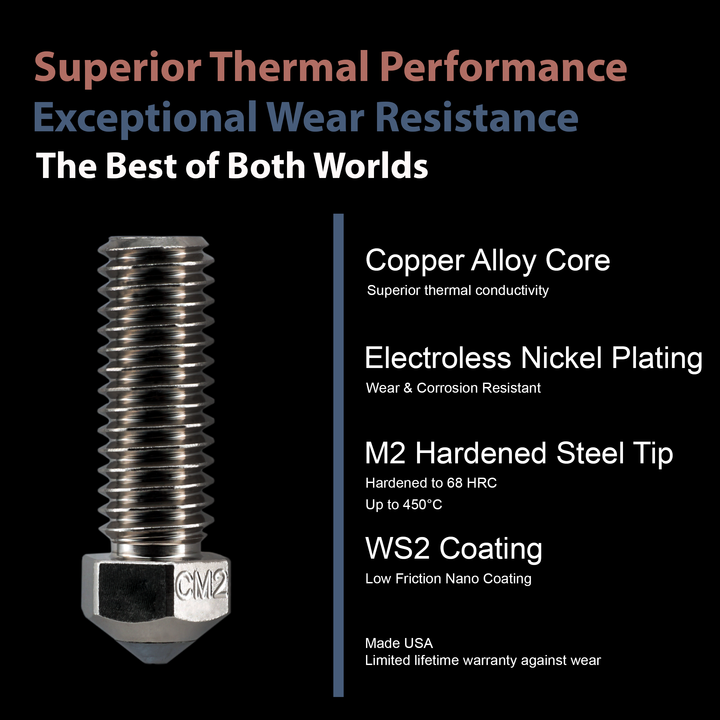 Dysza CM2 łączy wysoką odporność na temperaturę z maksymalną odpornością na zużycie. Podczas gdy tradycyjne dysze miedziane tracą wytrzymałość w wysokich temperaturach, specjalna mieszanka miedzi, chromu i cyrkonu pozostaje stabilna nawet w wymagających zastosowaniach. Hartowany stalowy czubek jest odporny na ścierne filamenty, takie jak włókno węglowe czy szklane, a powłoka nano minimalizuje przywieranie.