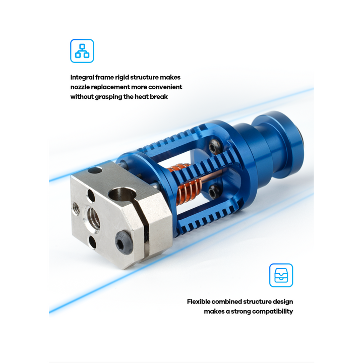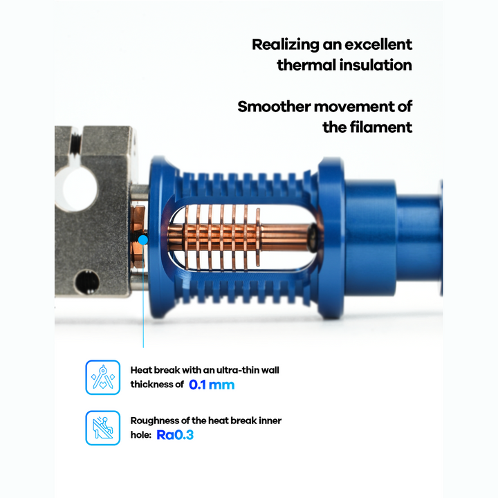 - Średnica wewnętrzna dyszy i Heat Break wynosi 0,4 mm dla płynnego przepływu filamentu i wyższej rozdzielczości druku.