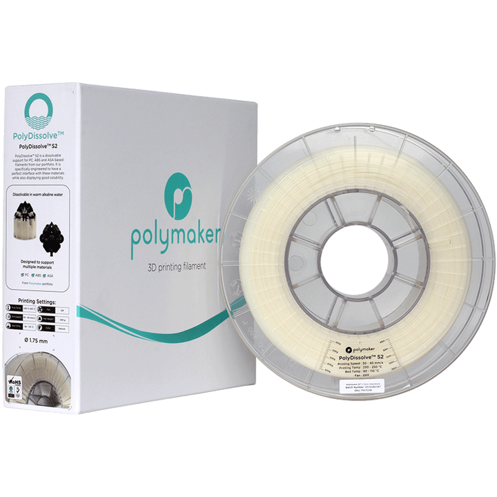 PolyDissolve™ S2 to rozpuszczalny materiał podporowy, specjalnie opracowany dla filamentów PC, ABS i ASA z portfolio Polymaker. Zapewnia doskonałą kompatybilność materiałową i rozpuszcza się niezawodnie po wydruku, co ułatwia realizację skomplikowanych modeli.