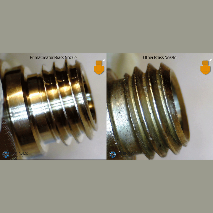 Wszystkie dysze PrimaCreator wykonane są z wysokiej jakości mosiądzu lub stali (w zależności od typu) i produkowane w nowoczesnej fabryce. Tolerancja wynosi mniej niż ± 0,01 mm. Zapewnia to, że Twój filament podczas ekstrudowania ma bardzo gładką i czystą powierzchnię, co oczywiście przekłada się na lepsze wyniki druku.